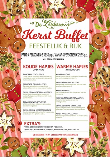 Het Kerstbuffet voor thuis bevat zowel koude als warme hapjes. Download de PDF (klik op afbeelding) om te zien welke lekker hapjes dit Kerstbuffet bevat.